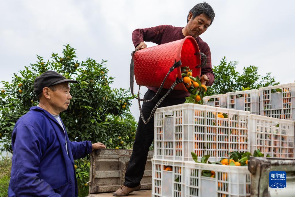 11月24日,在重慶市開州區竹溪鎮大海村的一個柑橘種植基地,村民在將採摘的砂糖橘裝箱。