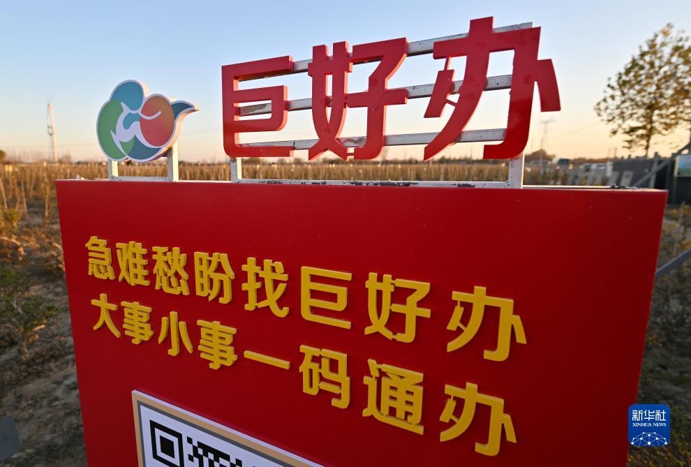 在巨鹿縣堤村鄉前堤村大美桑田金銀花種植基地田間設有一塊“巨好辦”二維碼服務牌,方便群眾直接掃碼辦事(11月23日攝)。當地通過建立金銀花全産業鏈數字平台,推動鄉村産業數字化,通過産品溯源體系,促進鄉村産品提升質量和標準。