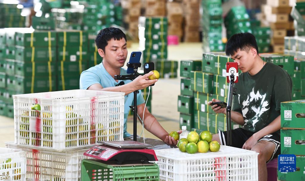 主播在琼中綠橙加工廠進行網絡直播銷售琼中綠橙(11月23日)。