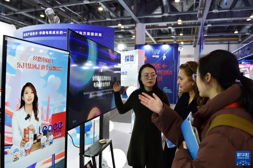 在第二屆全球數字貿易博覽會絲路電商館,外賓在“絲路電商日”活動中了解電商直播(11月24日攝)。
