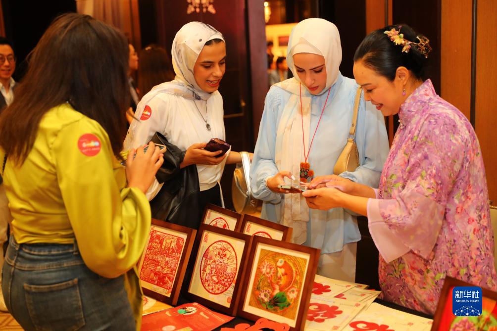 11月19日,在埃及開羅舉行的粵港澳大灣區世界級旅游目的地推介暨“魅力廣東”視覺展上,人們在非遺展區了解剪紙。