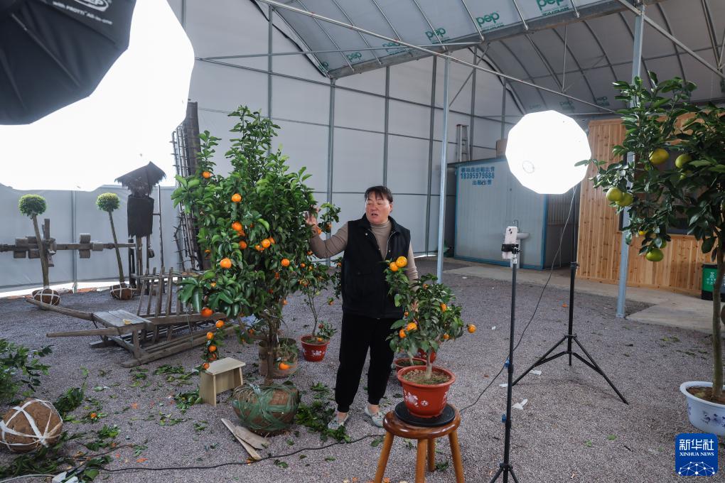 11月25日,在金華市金東區澧浦鎮前余村的“雲上果園”果苗直播基地內,種植戶施曉君在直播銷售果樹。