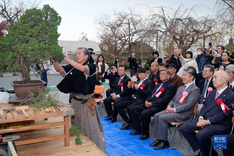 11月24日,在日本京都清水寺舉行的中日盆栽水石展開幕式上,日本春花園BONSAI美術館創始人、盆栽大師小林國雄(左一)表演盆栽作品創作過程。