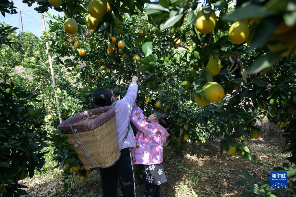 11月25日,小朋友在四川鹽邊縣紅格鎮益民村的紐荷爾臍橙基地體驗採摘。