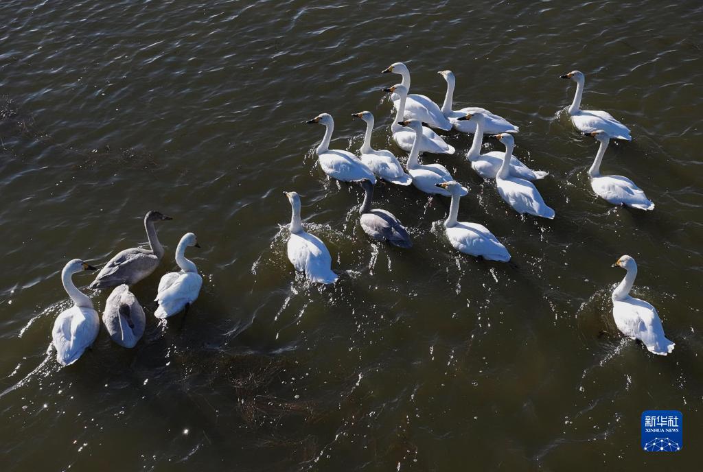 11月25日,天鵝在河北省唐山市豐南區黑沿子鎮沿海濕地水面上游弋(無人機照片)。