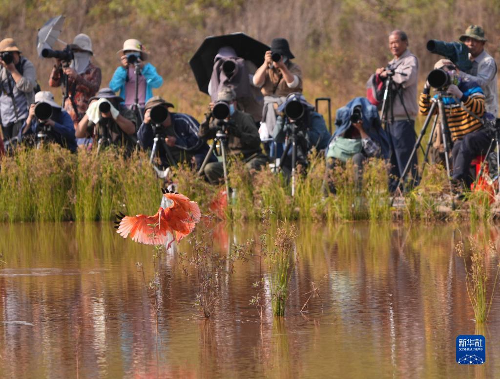 11月23日,觀鳥愛好者在拍攝美洲紅鹮。