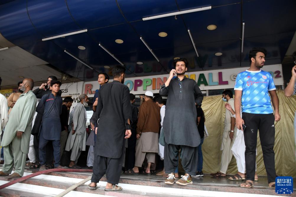 11月25日,在巴基斯坦卡拉奇,人們聚集在發生火災的商場外。