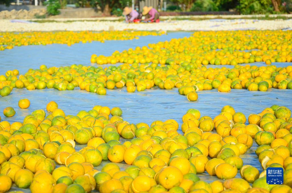 連日來,廣東省江門市天氣晴好,新會區果農把握有利時機,抓緊晾曬柑果果皮。新會柑經開皮、曬制、陳化等程序後可製成新會陳皮。