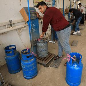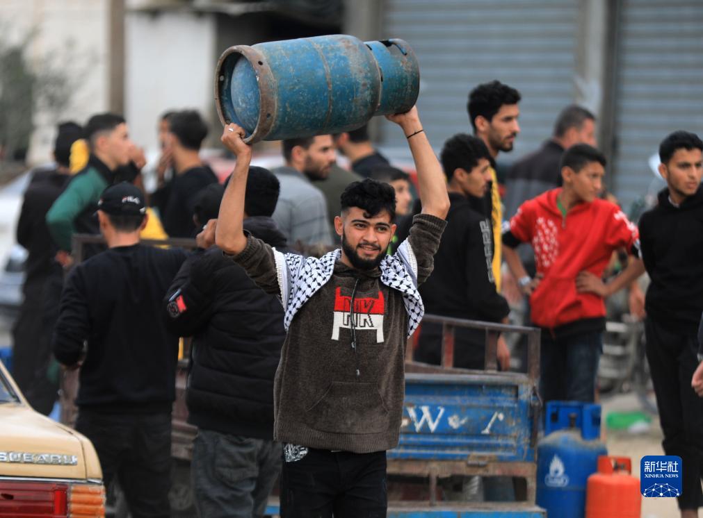 11月25日,在加沙地帶南部城市汗尤尼斯,巴勒斯坦人在充完天然氣後準備返回。