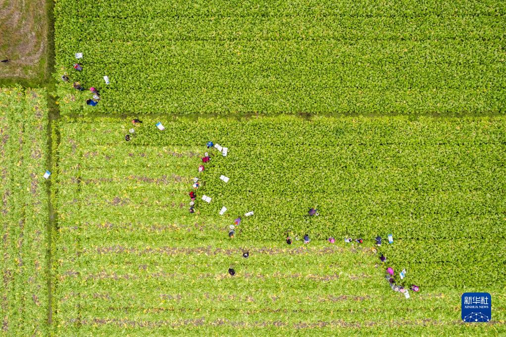 11月26日,在南縣武聖宮鎮太白洲村,菜農在采收榨菜(無人機照片)。