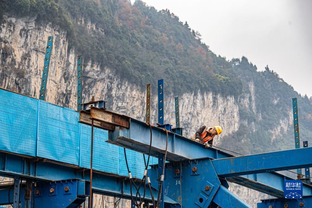 11月26日,在位於重慶市酉陽土家族苗族自治縣龔灘鎮的阿蓬江大橋施工建設現場,工人正在現場作業。