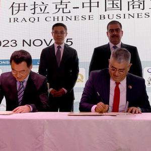 這是11月25日在伊拉克巴格達拍攝的伊拉克-中國商會成立儀式簽約現場。