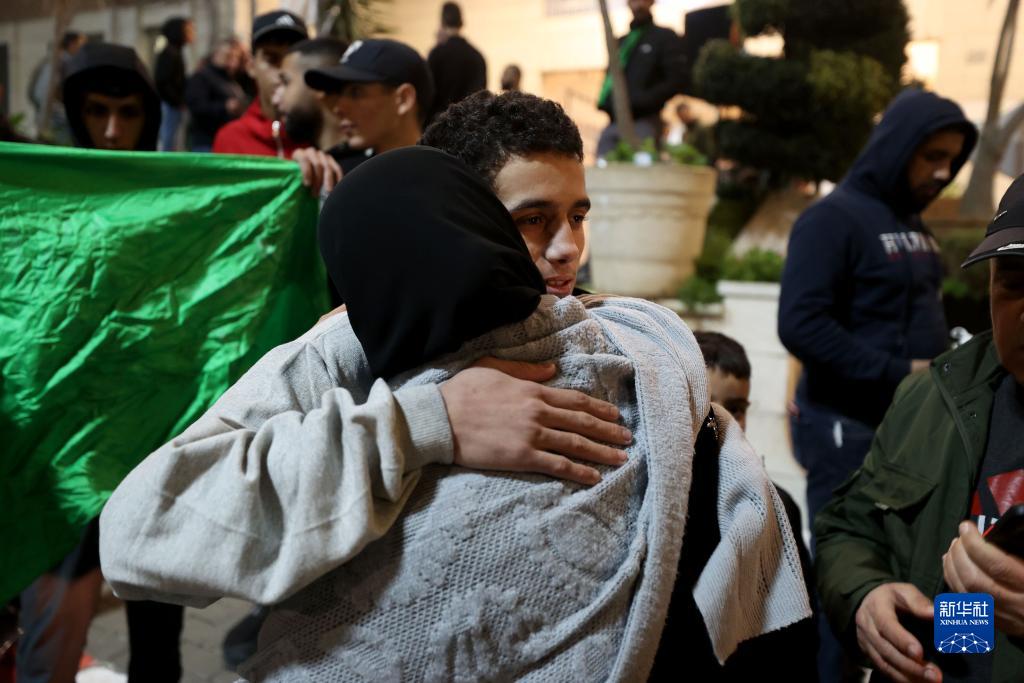 11月26日,在約旦河西岸城市比拉,獲釋巴勒斯坦被關押人員與親人團聚。