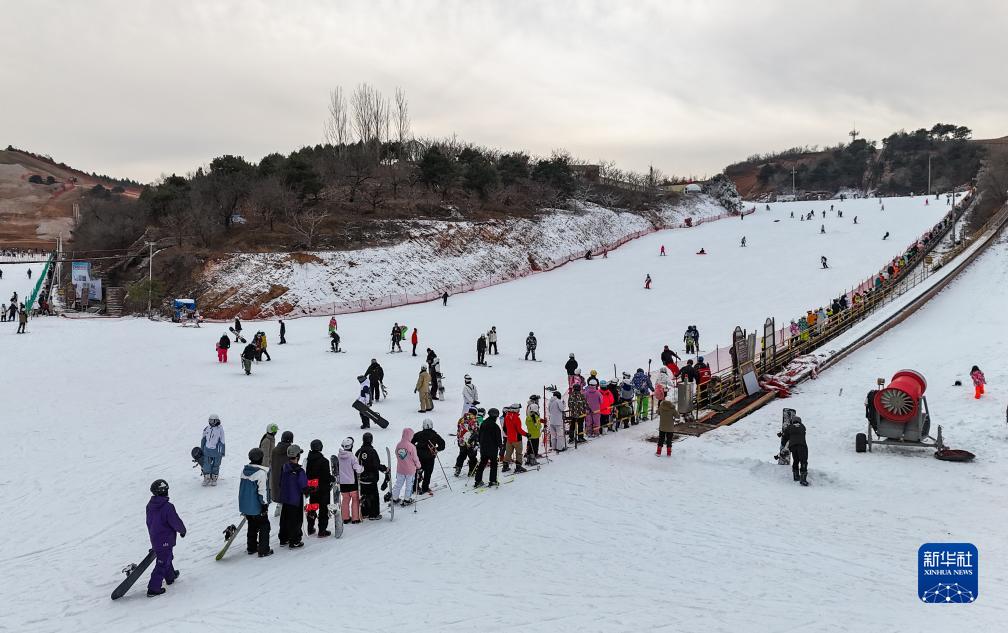 11月26日,滑雪愛好者在位於天津市薊州區的薊洲國際滑雪場內排隊體驗雪上運動(無人機照片)。