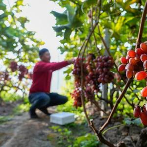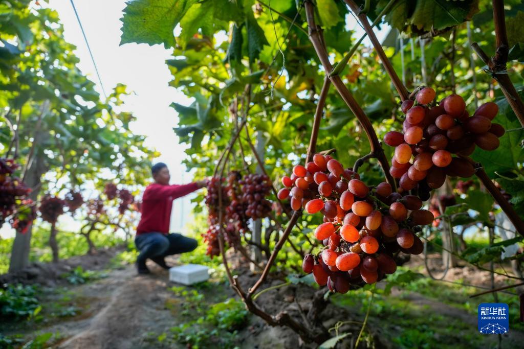 11月26日,游客在河北省灤州市茨榆坨鎮蘆葦莊村一處大棚內採摘葡萄。