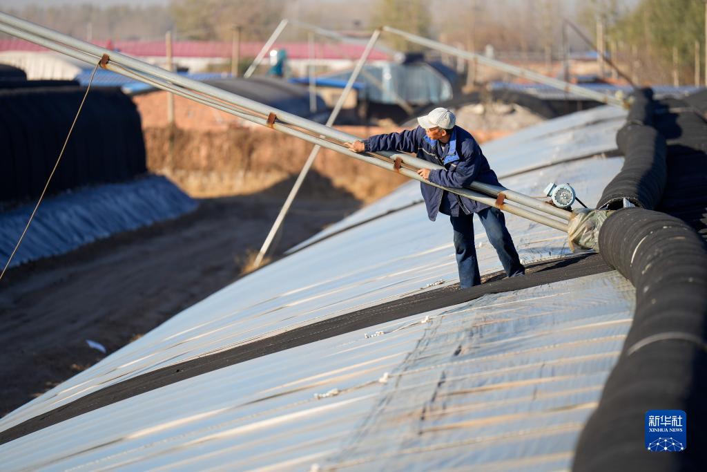 11月26日,河北省灤州市雷莊鎮後店子村農民在調整大棚保溫被。