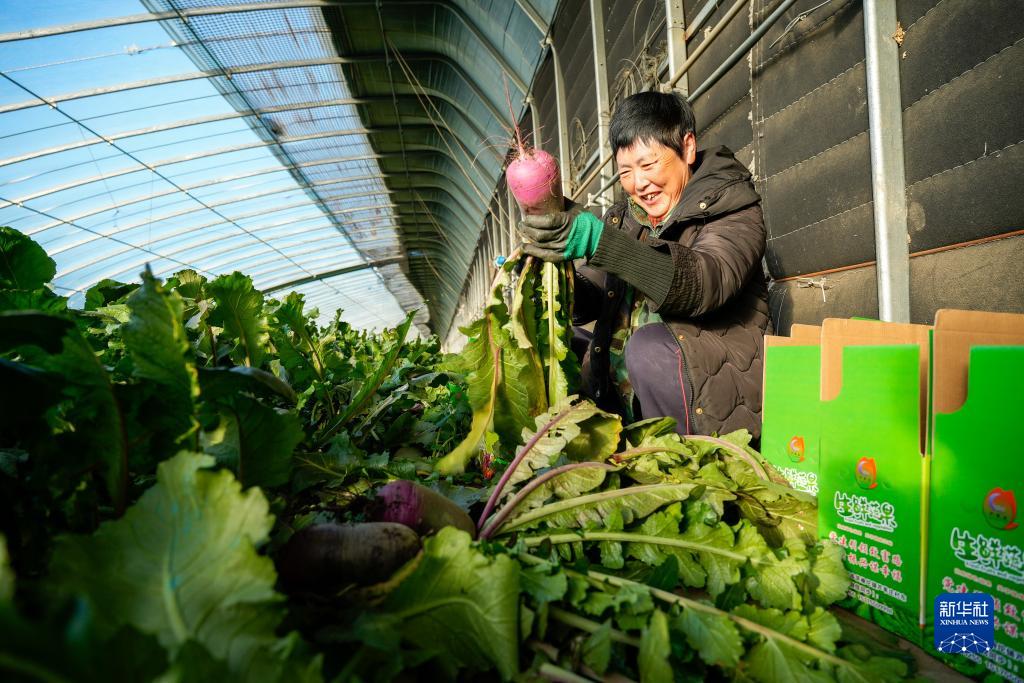 11月26日,河北省灤州市茨榆坨鎮蘆葦莊村農民在大棚內將采收的蘿蔔裝箱。