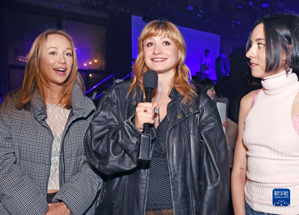 11月25日,在美國紐約,觀眾西爾薇·施泰格(中)接受採訪。她告訴記者,五條人是她見過最好的樂隊之一,她首次觀看就非常喜歡他們的表演。