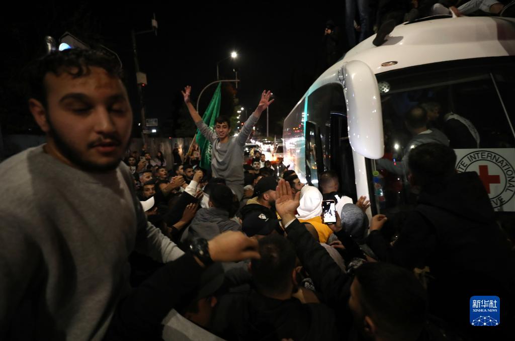 11月26日,在約旦河西岸城市拉姆安拉,人們慶祝被關押的巴勒斯坦人獲釋。