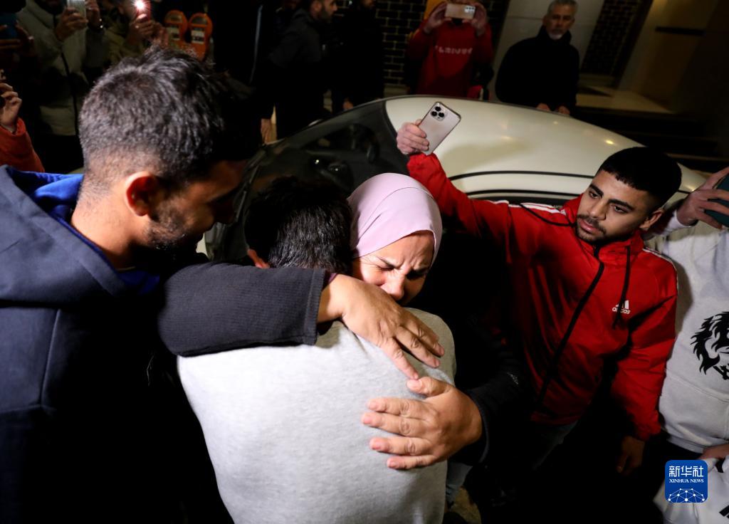 11月26日,在約旦河西岸城市拉姆安拉,獲釋的巴勒斯坦人與親人團聚。