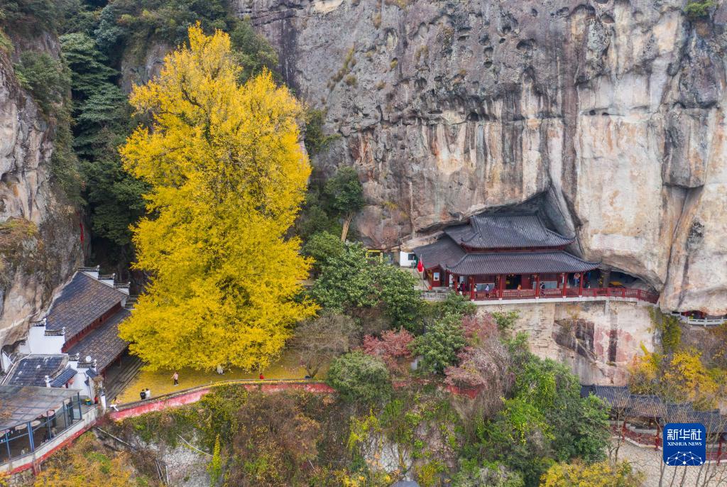 11月26日,空中俯瞰懸崖旁的古銀杏樹(無人機照片)。