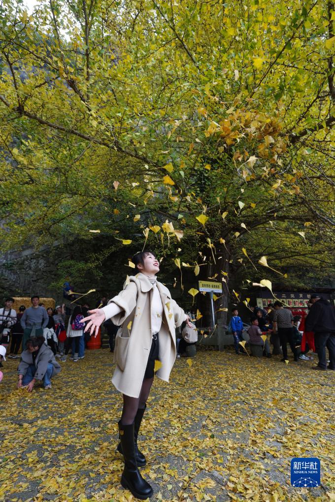 初冬時節,浙江省建德市大慈岩懸空寺前的古銀杏樹披上“黃金甲”,漫天飛舞的銀杏“雨”,構成一幅絕美的圖景,成為當地鄉村旅游的網紅打卡地。這棵古銀杏樹樹高39.5米,胸徑1.3米,曾入選“杭州十大最美古樹名木”,樹齡已有700多年,是建德的銀杏之王。