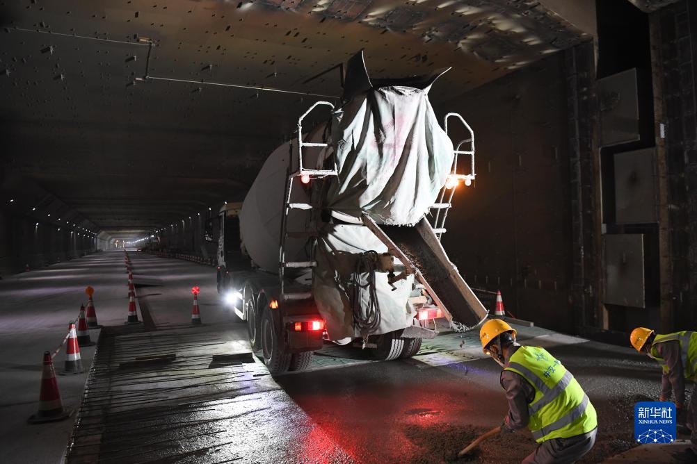 11月28日,工人在深中通道海底沉管隧道內進行最後的壓艙混凝土澆築。