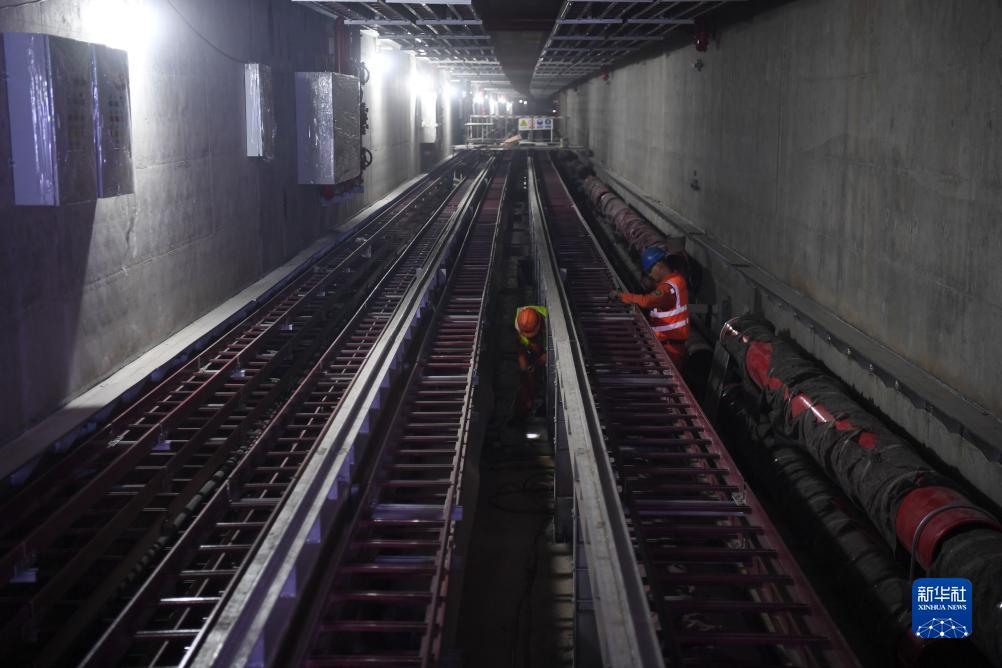 11月27日,工人在深中通道海底沉管隧道內進行安裝作業。