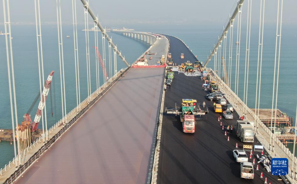 11月27日,保利長大工人在深中通道伶仃洋大橋進行路面鋪裝工作(無人機照片)。