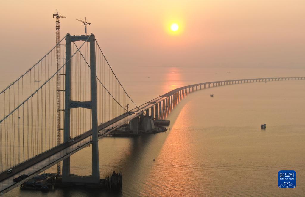 這是夕陽下的深中通道伶仃洋大橋西塔(11月27日攝,無人機照片)。