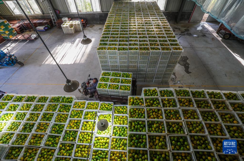 11月28日,浙江省麗水市慶元縣黃壇村的外婆家水果專業合作社甜桔柚基地的成品倉庫內,工作人員在搬運採摘下來的甜桔柚。