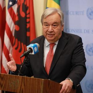 11月27日,聯合國秘書長古特雷斯在紐約聯合國總部向記者講話。