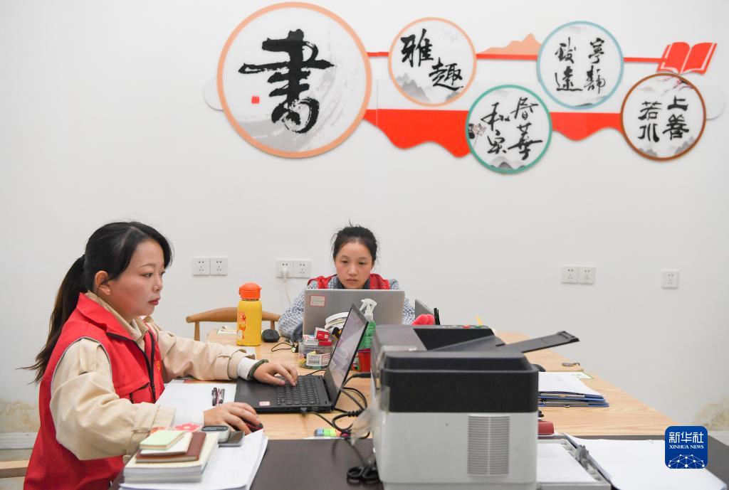 11月28日,余白楊(左)和同事在辦公室整理信息。
