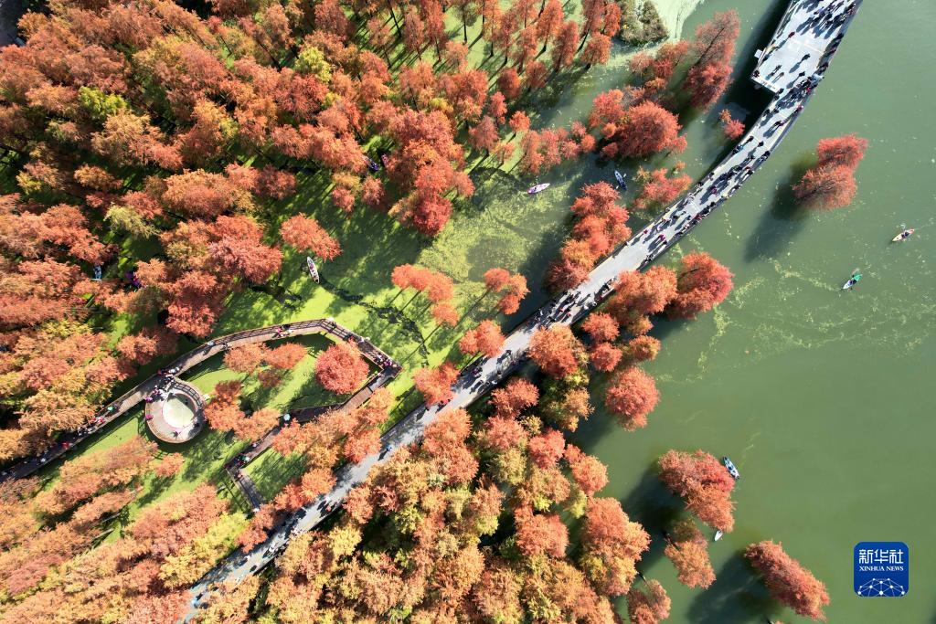 浙江省杭州市臨安區青山湖景區水上森林色彩斑斕(11月28日攝,無人機照片)。