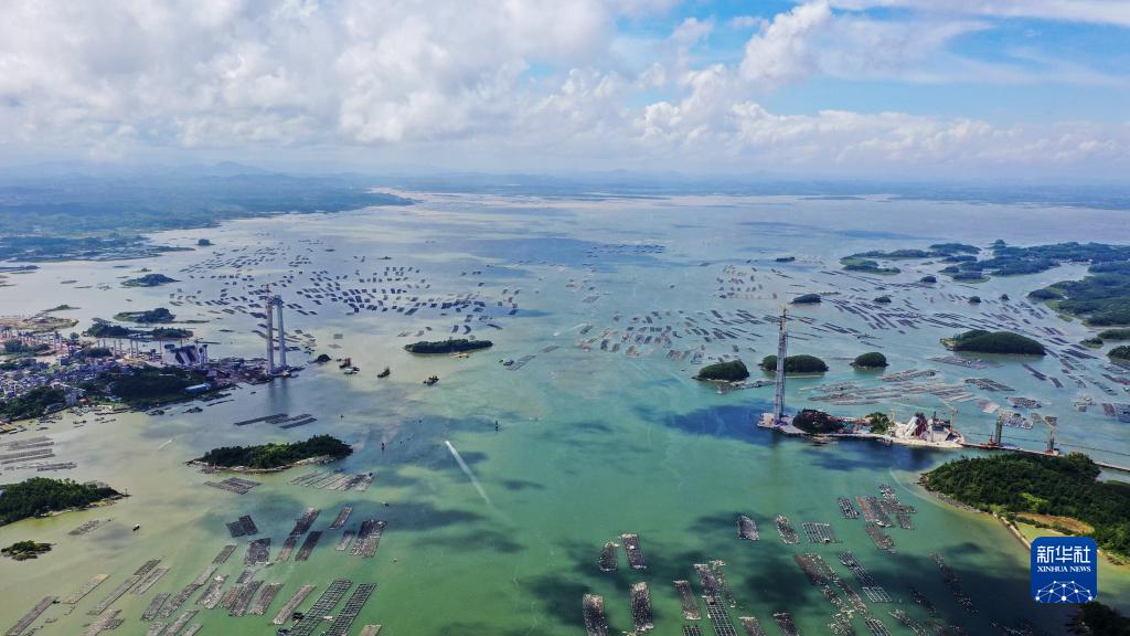這是2022年8月27日在平陸運河出海口附近拍攝的茅尾海龍門大橋段水域(無人機照片)。