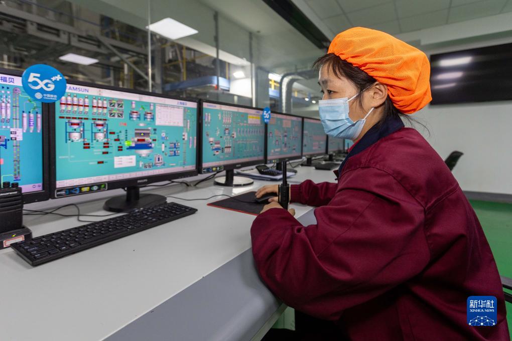 11月28日,技術工程師在生産線邊的中央控制室內關注5G通信下智能化生産狀況。