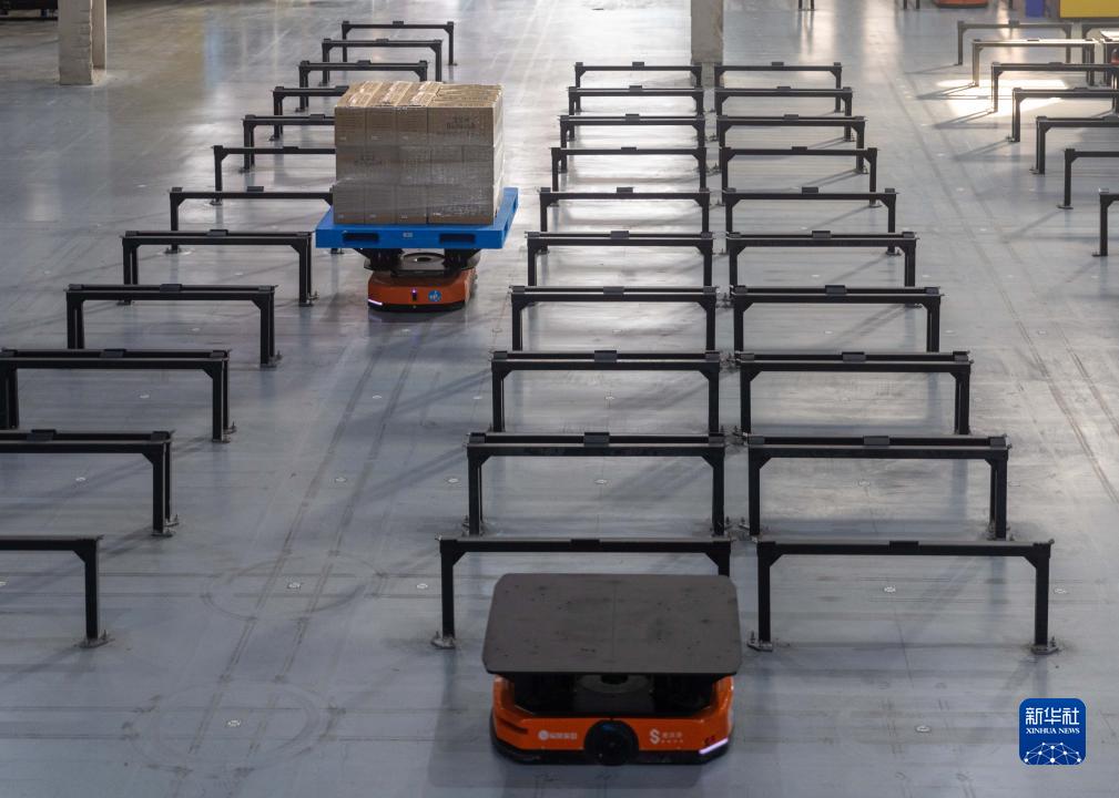 11月28日,5G智能運輸車在寵物食品倉庫中工作。5G智能運輸車可自動匹配需求,實現24小時無人化作業,提升倉儲運輸效率。