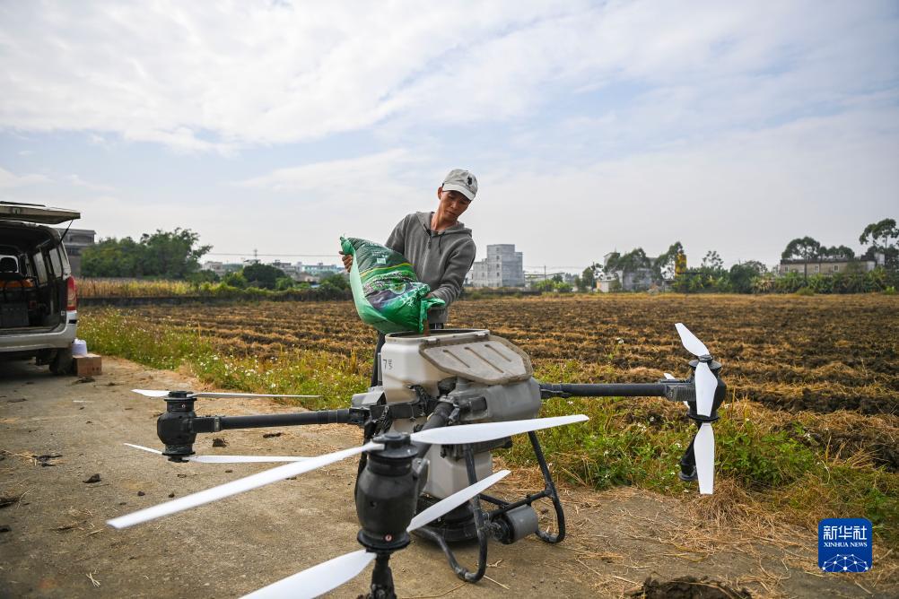 11月29日,在廣西貴港市港北區,技術人員將綠肥倒入農用無人機裏。