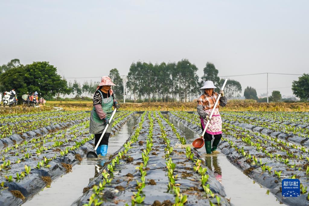 11月29日,在廣西貴港市港北區,村民給蔬菜澆水。