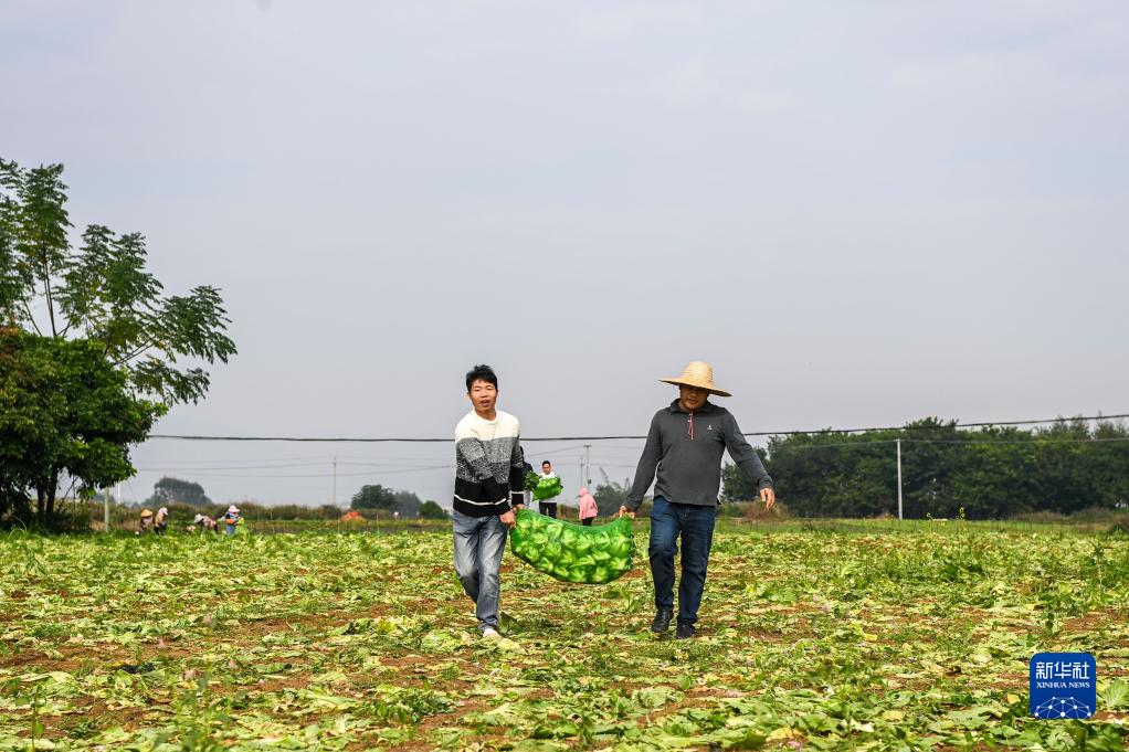 11月29日,在廣西貴港市港北區,村民搬運采收的蔬菜。
