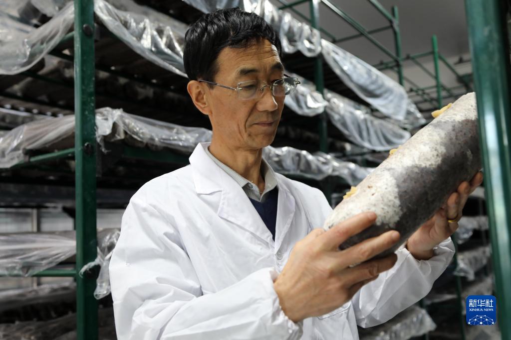 11月29日,在後官寨鎮司官寨村食用菌基地,工作人員查看新培育的菌種。
