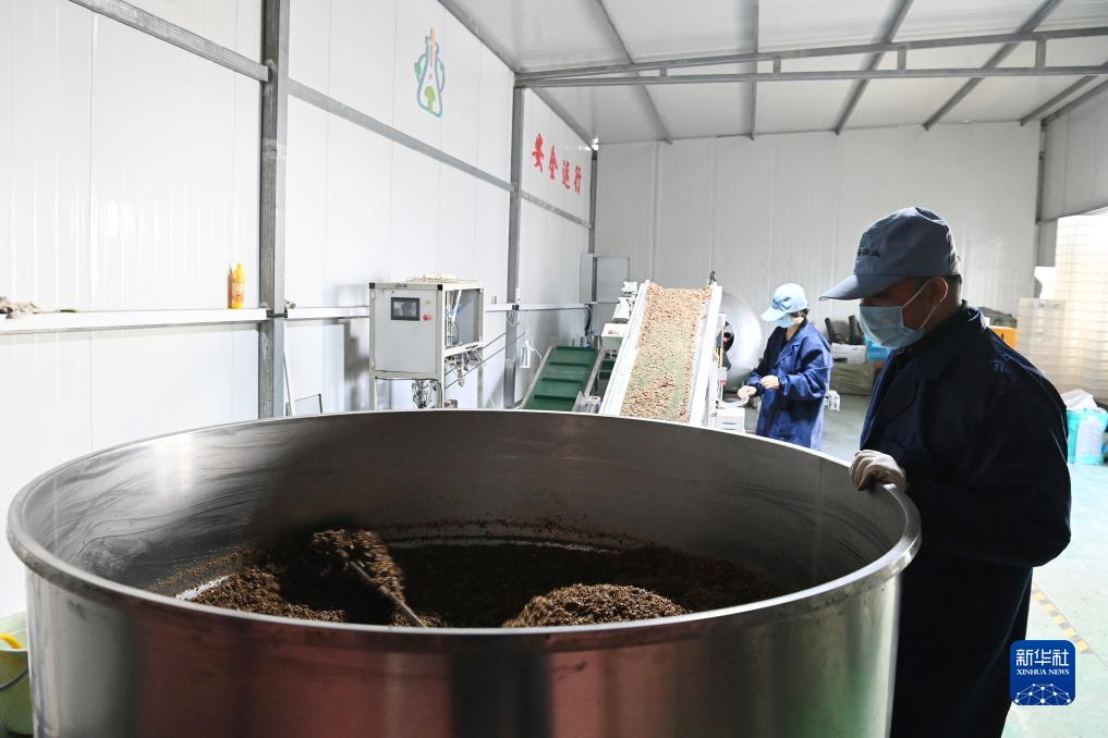 11月29日,在後官寨鎮司官寨村食用菌基地,工作人員查看菌種原料。