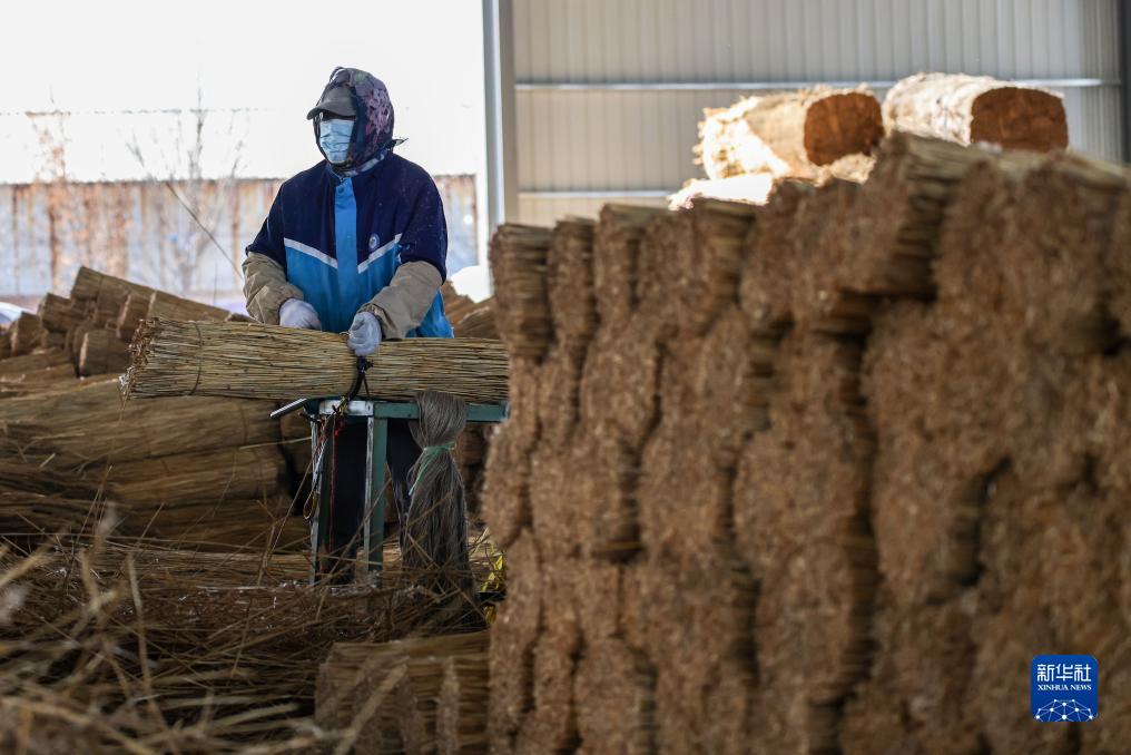 11月29日,村民在水灣鎮蘆葦産業園內加工蘆葦。