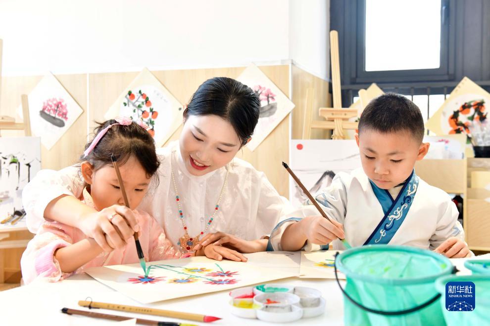 11月29日,在濟南市七里山幼教集團山望幼兒園國畫手工坊,胡文婭老師教孩子們畫畫。