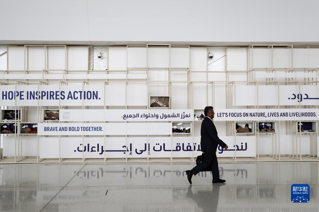 11月29日,在阿聯酋迪拜,一名參會人員走過聯合國氣候變化大會的標語展板。