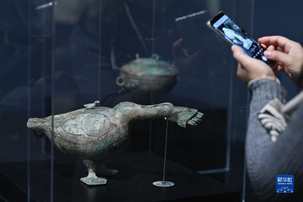 11月29日,參觀者在清華大學藝術博物館拍攝戰國時期的鴨形銅尊。