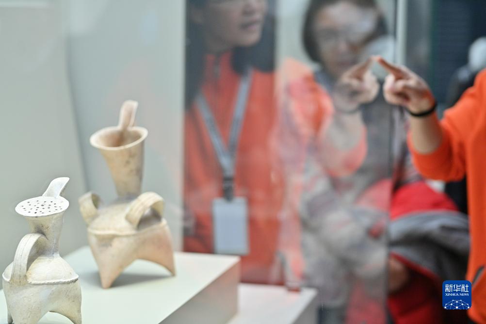 11月29日,講解員在清華大學藝術博物館介紹大汶口時期的白陶鬶(國家一級文物)。
