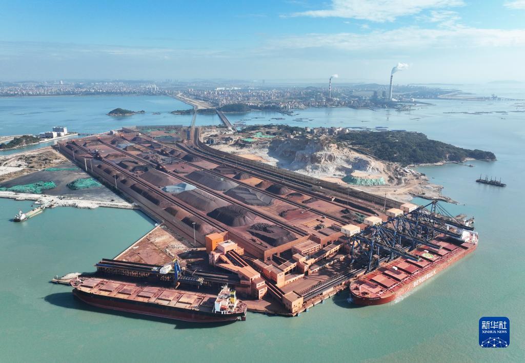 這是位於福建莆田的湄洲灣港羅嶼鐵礦石碼頭(11月29日攝,無人機照片)。