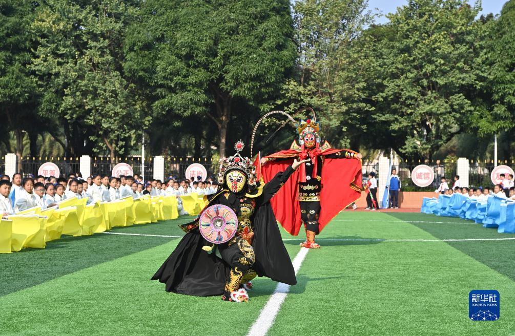 11月29日,學生和老師在濱湖路小學表演《變臉》。