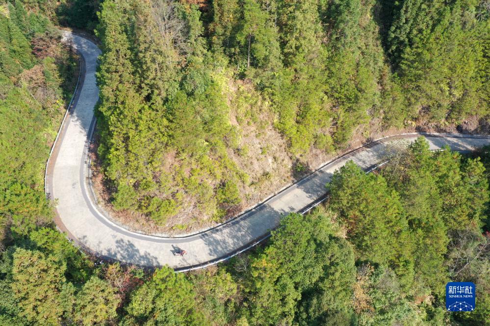 11月29日,在廣西龍勝各族自治縣龍脊鎮,潘從漢老師騎着摩托車前往滿田小學(無人機照片)。